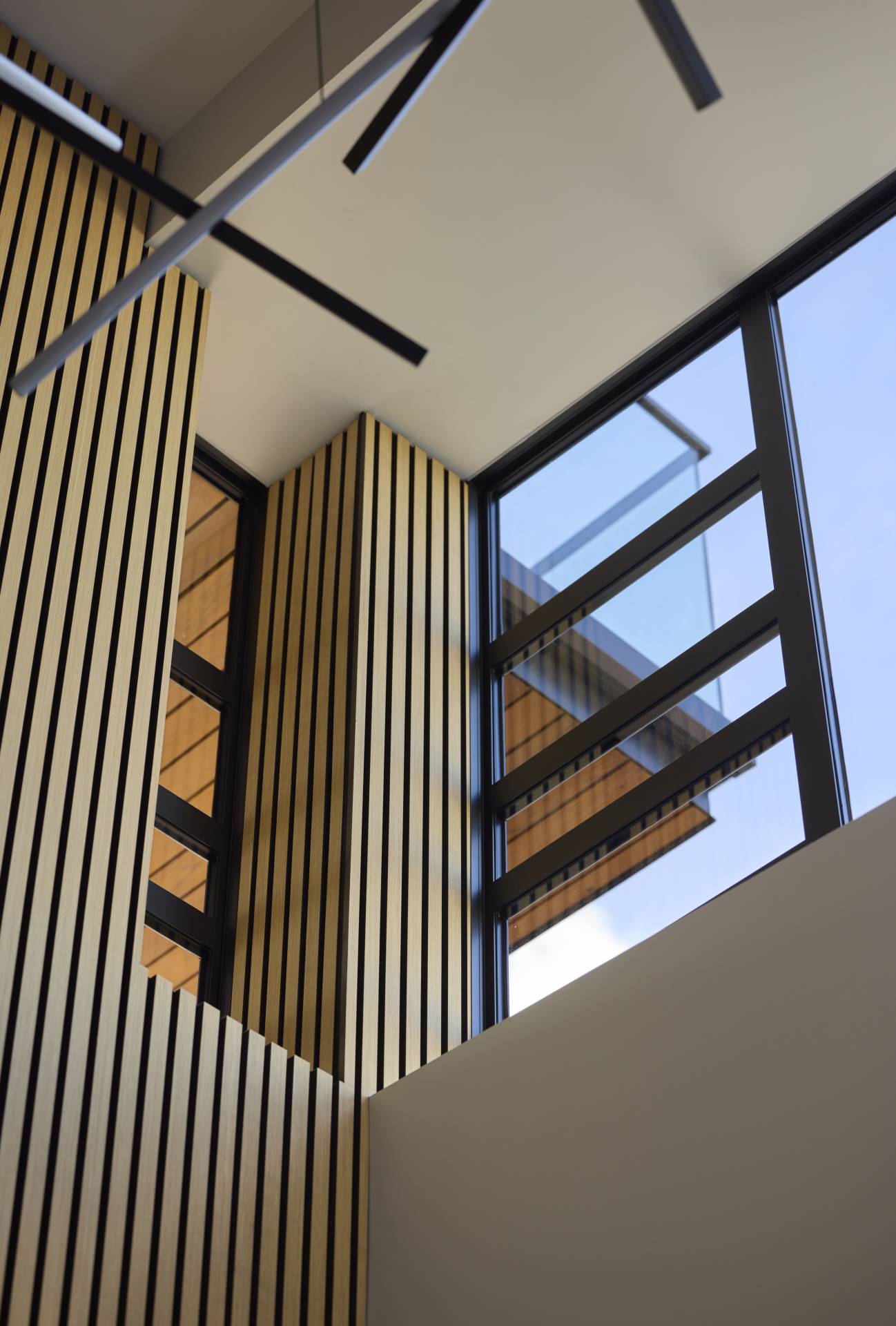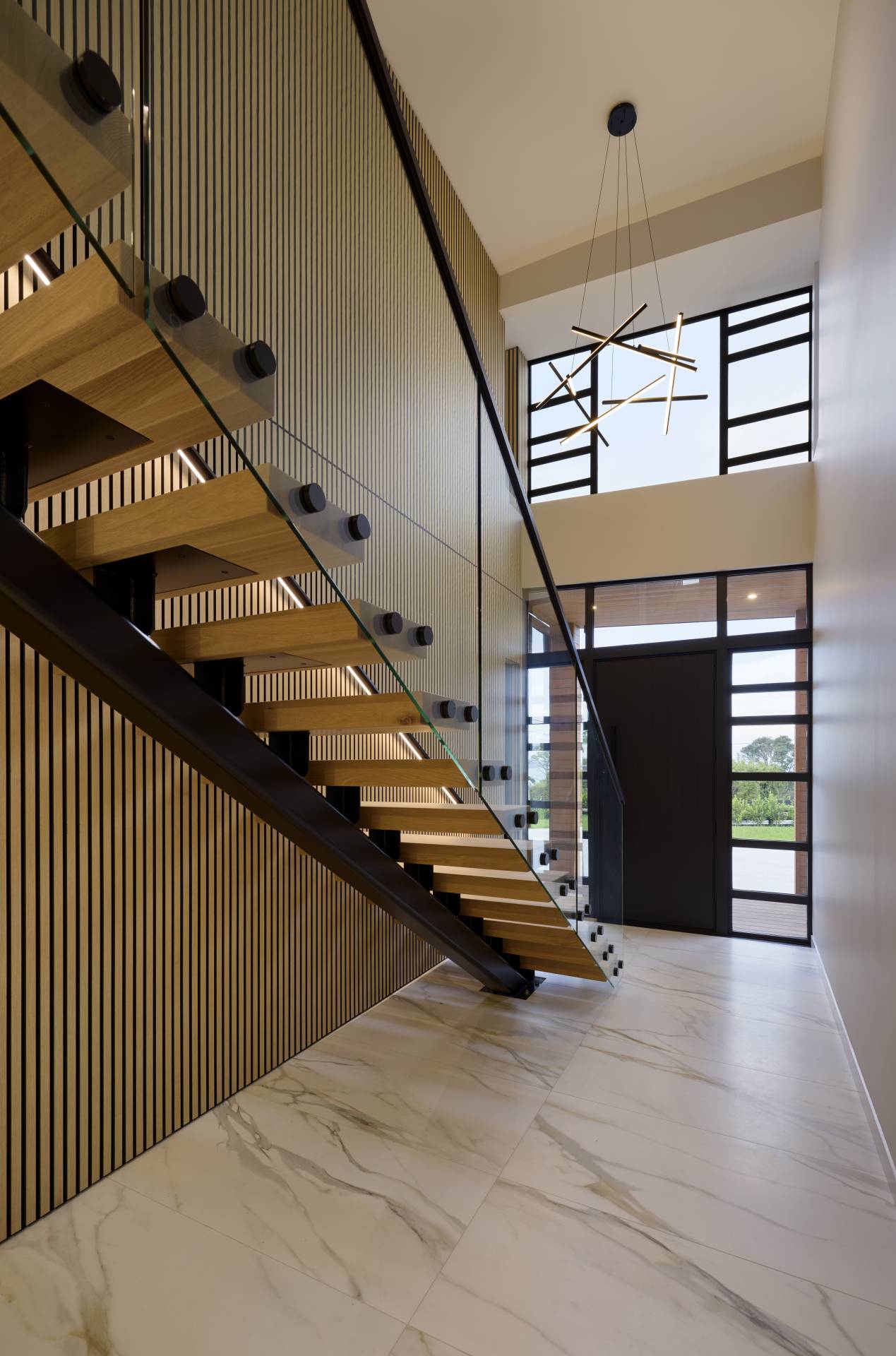 The vision for the home was strongly driven by the surrounding views, making glass a central design feature. This resulted in striking entry doors and an expansive stairwell with floor-to-ceiling windows that frame the landscape and bring the outdoors in.