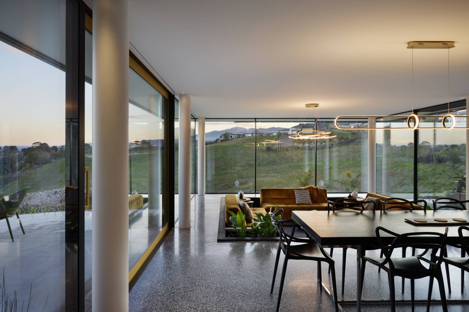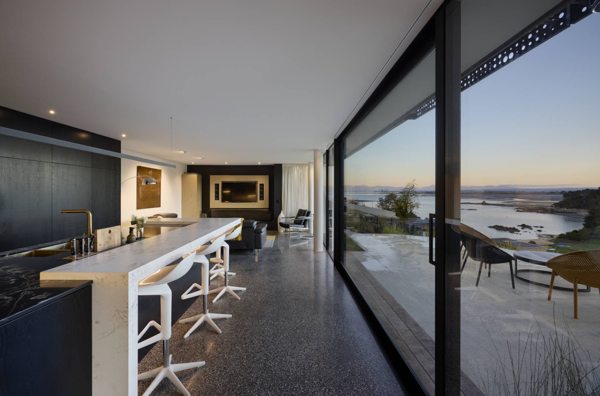 The result? A house where the boundary between indoors and outdoors seems to disappear. The sunken lounge has those gorgeous views uninterrupted by floor-to-ceiling windows, and the large sliders opening from the dining and living areas means Paul and his family can fully connect with the landscape, no matter what the weather’s doing.