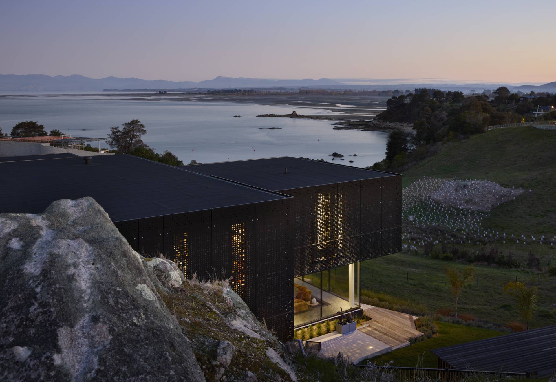 For building company owner Paul Richards, crafting a home for himself and wife Melissa perched above Dummy Bay in Kaiteriteri, near Nelson, was an opportunity to do something a bit special with a unique piece of land. The final result is a striking home that boasts sweeping coastal views from every room, including the bathrooms.