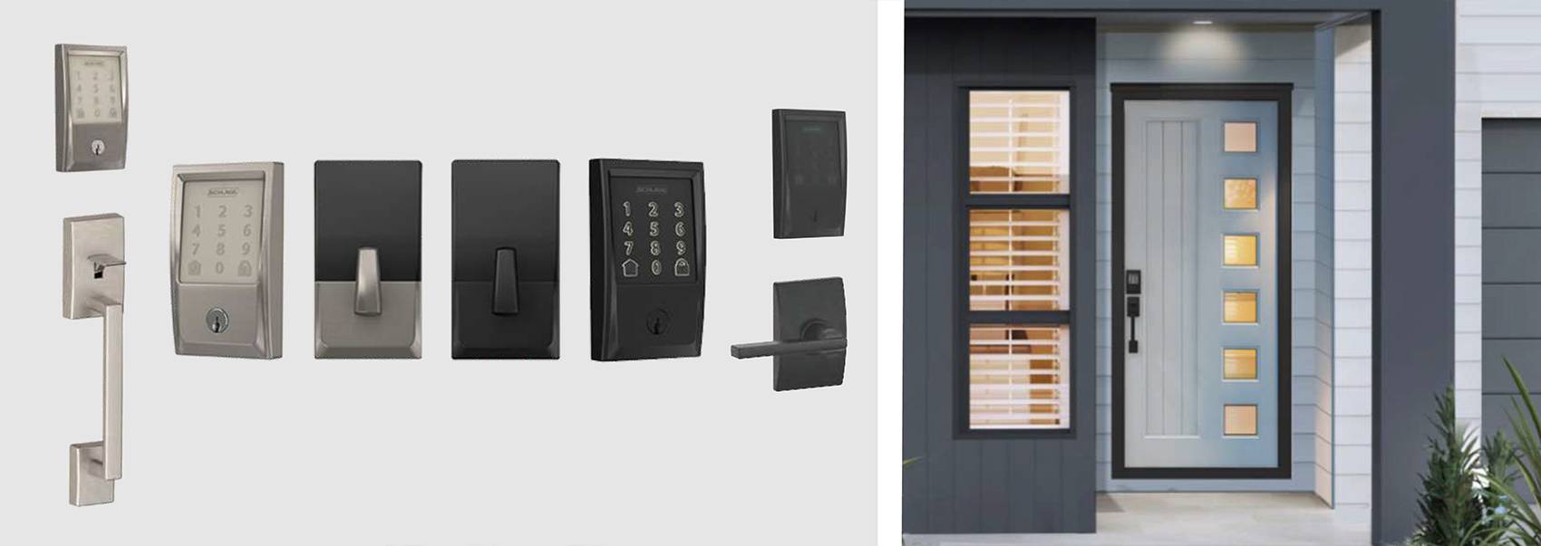 The Encode Smart Wi-Fi Deadbolt connects directly to your home Wi-Fi. There’s no need for extra accessories or hubs, allowing you full control of your lock from anywhere. Simply pair your lock with the Schlage Home app on your smartphone to lock or unlock your door and add or delete user codes from anywhere. You specify who has access and when by setting up to 100 codes, or sending virtual keys to guests via text or email. Encode can be installed with either the Century Latitude Handle Set (above left) or the Latitude Lever Set (above right).